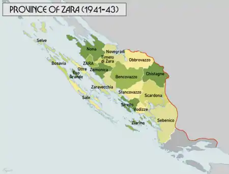 The Province of Zara (Italian: Provincia di Zara) was a province of the Kingdom of Italy, officially from 1918 to 1947. In 1941 it was enlarged and made part of the Italian Governorate of Dalmatia, during World War II, until 1943.