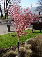 Prunus × blireiana (or blireana), the purple-leafed plum[1] or double-flowering plum,[2] is an ornamental flowering plant hybrid in the genus Prunus. It is a cross between the Japanese apricot (Prunus mume) and the purple-leaved plum cultivar Prunus cerasifera 'Pissardii'.[1][3]