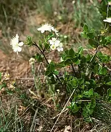 The bark is dark brown with yellow lenticels. The leaves are oblanceolate to obovate, about 12 mm by 6 mm, with acuminate apex, glabrous above, thick, serrated with crenate margin, dark green, yellow in autumn, with a short petiole.