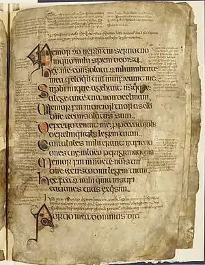 The Psalter of Caimín is a medieval Irish illuminated manuscript likely produced in the 11th century, possibly on the island of Inis Cealtra in Lough Derg. It is badly damaged, with only fragments surviving. These consist of six folios, containing verses 1-16 and 33-116 of Psalm 118 (Beati Inmaculati...), a psalm that would have had 176 versus in total, and was a favourite of the early Irish church. It is possible that the Psalter only ever consisted of this full psalm, perhaps also with notes and commentary,[1] although it may have been much larger, containing the entire Psalter.[2] It kept in the library of University College Dublin (MS.A.i)