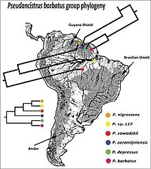 - ↑ Chambrier, S.D., & Montoya-Burgos, J.I. (2008). Pseudancistrus corantijniensis, a new species from the Guyana Shield (Siluriformes: Loricariidae) with a molecular and morphological description of the Pseudancistrus barbatus group. Zootaxa, 1918, 45-58.