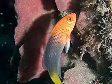 A small marine fish that reaches five inches in length. Males are grey with a bright orange head, while females are dark grey.