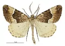 ♂. 32 mm. Head and palpi brown. Thorax greyish brown. Antennae brown, in ♂ moderately bipectinated, pectinations gradually decreasing in length apically, last twelve or thirteen segments simple. Abdomen greyish ochreous, sprinkled with fuscous. Legs ochreous, mixed with fuscous, anterior pair blackish, all tarsi annulated with ochreous. Forewings elongate triangular, costa moderately arched, apex blunt, termen bowed, oblique; whitish ochreous; basal 3/5 fuscous brown; first line indicated by ochreous outwards-curved fascia on costa at 1/4; outer edge of median band (margin of dark area) broadly and strongly projecting at middle, margined with white; a broad brownish terminal area including obscure white waved subterminal line: fringes (damaged) apparently brown mixed with ochreous. Hindwings pale ochreous sparsely sprinkled with brown; an interrupted brown line round termen: fringes ochreous.[5]