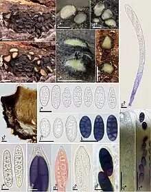 | Morphological features of Pseudographis. a–e, g, l–o Pseudographis pinicola, now Pseudographis rufonigra a dried apothecia on bark b same apothecia hydrated c–e hydrated apothecia g dead ascus containing living ascospores (cb), l ascospores m ascus containing mature ascospores, detail of apex (in dilute L) n ascospore emerging from ascus apex (Cr) o ascus apex. f, h–k, p–r Pseudographis elatina f hydrated ascomata h 15 µm thick longitudinal section i–j ascospores k ascospores (in dilute L) p detail of ascus apex (L) q turgid ascus r same ascus (in dilute L). All microphotographs of cells and tissues mounted in water unless otherwise noted: cresyl blue (cb), Congo red (Cr), Lugol's solution (L). † = dead, * = living. Scale bars: 1 mm (a–f); 50 µm (h, q–r); 20 µm (i–k); 10 µm (g, n–p); 5 µm (l–m) | |