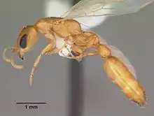 Workers are yellow, orange, or brown. They are slender with large eyes, short antennal scapes and a well-developed sting.[1][2] Head widths measure 0.68–0.89 millimeters. The surface of the head is shiny, due to the lack of a fine hairy covering. Workers of P. pallidus are monomorphic.[1][3]