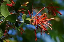Psittacanthus calyculatus is hairless, with nearly terete branches.[3] The leaves are opposite and ovate or lanceolate, having almost no petiole, and without veins.[3] The inflorescences are terminal and in groups of three yellow to scarlet flowers which have cup-shaped bracts under them.[3]