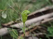 Pterostylis metcalfei, commonly known as Metcalfe's greenhood,[2] or Ebor greenhood[3] is a species of orchid that is endemic to the Northern Tablelands of New South Wales. As with similar greenhoods, the flowering plants differ from those which are not flowering. The non-flowering plants have a rosette of leaves flat on the ground but the flowering plants have a single flower with leaves on the flowering spike. This greenhood has a dark green and white striped flower and is known from only three locations. It is listed as an endangered species.