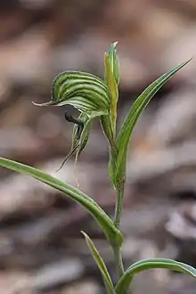 Pterostylis sargentii, is a terrestrial, perennial, deciduous, herb with an underground tuber. Non-flowering plants have a rosette of between three and six leaves 5–18 mm (0.2–0.7 in) long and 3–8 mm (0.1–0.3 in) wide on a short stalk. Flowering plants lack a rosette but have between three and ten stem leaves which are 8–30 mm (0.3–1 in) long and 2–4 mm (0.08–0.2 in) wide on the flowering stem. Up to six white and green or brown striped flowers are borne on the flowering stem which is 50–200 mm (2–8 in) high. The flowers are 15–25 mm (0.6–1 in) long and 5–7 mm (0.2–0.3 in) wide. The dorsal sepal and petals form a hood or "galea" over the column with the dorsal sepal having a thread-like tip 2–3 mm (0.08–0.1 in) long. The lateral sepals turn downwards are joined for about half their length, then suddenly taper to narrow tips 4–6 mm (0.16–0.24 in) long. The labellum is 4–5 mm (0.16–0.20 in) long, about 2 mm (0.08 in) wide, dark brown with three lobes, the side ones with a large, horn-like appendage. Flowering occurs from July to October.[3][4][5]