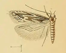 The wingspan is 7.5โ€“9 mm. The forewings are pale fawn brown with whitish cinereous (ash grey) lines and streaks. The hindwings are pale grey.[2]