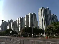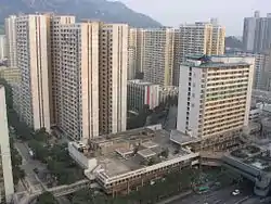 Yau Oi Estate (Chinese: 友愛邨) is the third public housing estate in Tuen Mun. It was built between 1979 and 1982[5] on reclaimed land of Castle Peak Bay.[44] Consisting of 11 residential blocks, it was the largest single subsidized housing development in Hong Kong, with 9,153 units and a population of more than 35,000.[84]