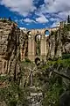 The Puente Nuevo (Spanish pronunciation: [ˈpwente ˈnweβo], "New Bridge") is the newest and largest of three bridges that span the 120-metre-deep (390 ft) chasm that carries the Guadalevín River and divides the city of Ronda, in southern Spain. Completed in 1793, the architect was José Martin de Aldehuela and the chief builder was Juan Antonio Díaz Machuca.