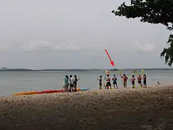 Location of Pulau Sejahat (red arrow) as seen from Changi Beach Park.