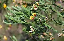 Pultenaea platyphylla, commonly known as flat-leaf bush-pea,[2] is a species of flowering plant in the family Fabaceae and is endemic to south-eastern continental Australia. It is an erect, rigidly-branched shrub with narrow egg-shaped to wedge-shaped leaves with the narrower end towards the base, and yellow to orange and red to purple flowers.