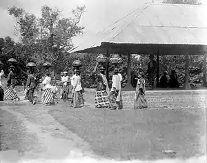 When the festival was held, the first procession was called mendak pesaji, which was an accompaniment of offerings marching into area of the pura, in front of the offerings there were dancers Batek Baris, who dressed in the Dutch East Indies army, the dancers spoke Dutch but using sasak accent, where the dancer is accompanied by music Gendang beleq[5][2][4]