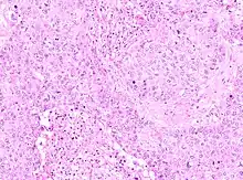 The microscopic histopathology of PACB tumors prepared with hematoxylin and eosin staining shows that >90% of the tumors consist of apocrine gland-like tissue. The lesions must also show that tumor cells have broken through their ducts of origin to invade adjacent tissue in at least one area. Most of the tumor cells (termed type A cells[15]) typically appear somewhat more irregular than normal apocrine gland cells. They have abundant eosinophilic (i.e. pink due to the uptake of the eosin dye) cytoplasm which contain numerous granules[11] and large mitochondria.[15] Their nuclei are large, variably sized and shaped, have multiple nucleoli (which are eosinophilic[11] and may be distinctively large in size[14]), and are surrounded by highly visible nuclear membranes. The cells are arranged into solid sheets, nests, papillae, and/or cords (see Figs. 1 and 2).[11] The tumor cells' cytoplasmic granules test positive when treated with the PAS diastase stain.[16] Binucleated cells, i.e. cells with two nuclei, are common.[10] Less commonly, type B apocrine cells are present; these cells have a more foamy and vacuolated cytoplasm (i.e. containing multiple vacuoles) than type A cells[15] and often resemble foamy histiocytes or sebaceous gland cells.[17] The tumor cells have low to moderate rates of proliferation based on their Ki-67 protein levels.[7] PACB tissues may have localized areas that contain mucin-like secretions within their luminal ducts,[10] localized areas of necrosis (i.e. foci containing dead or dying cells), and/or microcalcifications spotted throughout the apocrine tissue.[11] The stroma (i.e. connective tissue between the sheets, nests, papilla and cords of cells) typically contains non-malignant, infiltrating lymphocytes (see Fig. 3). In an examination of 41 PABC tumors, 33 (80.5%) had <50% of their stroma tissues infiltrated with these cells while 8 (19.5%) had ≥50% of their stroma tissues infiltrated with them. Tumors with ≥50% of their stroma infiltrated with lymphocytes tended to have carcinoma cells that had high rates of proliferation.[11] Metastatic and recurrent PACB tumors have a histopathology similar to their original primary tumors.[14]