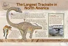 The more than 100 trackways, made up of more than 1500 individual footprints, were made by both biped and quadruped dinosaurs. The tracks occur in limestone of the Jurassic Morrison Formation. The site formed along the shore of a large freshwater lake at the time the tracks were made. A previously unmapped region was discovered in 2012, where removal of alluvium revealed 90 new trackways, showing parallel prints.[2]