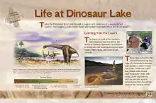 In 2001, the first discoveries in the Picketwire Canyonlands area were made of related fossil dinosaur bones. Fieldwork has continued each year on recovery of the massive bones of a sauropod (brontosaur) skeleton. The project has been supported by volunteers and the Sternberg Museum of Natural History of western Kansas.[4] Continued exploration of fossils in the canyonlands has revealed tetrapods. This finding had major implications for understanding of geology in the area. As a result, researchers in 2012 proposed a "major revision of lower Mesozoic stratigraphy in the Picket Wire Canyonlands" and a "critical reappraisal of understanding of the correlation of Triassic strata from Wyoming, through and under the Denver Basin, to the High Plains of Oklahoma and New Mexico."[5]