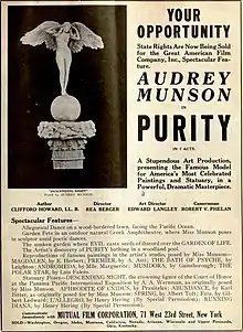 Purity is a 1916 American silent drama film, directed by Rae Berger and starring Audrey Munson, an artist's model who posed for many statues in New York City and the 1915 San Francisco Panama–Pacific International Exposition. The film's plot was written by Clifford Howard, art direction was by Edward Langley, and choreography was by Geneva Driscoll. The film's nude scenes caused it to be banned and preached against in some towns.[1]