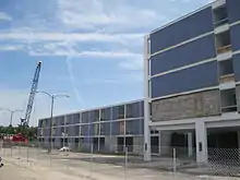 The Purple Hotel closed in January 2007 due to health code violations. A village inspection had found mold in 208 of the 225 rooms visited as well as failing windows, roof leakage, and problems with the hotel's fire sprinkler system. After the hotel closed, the village threatened to demolish it unless a developer was willing to restore it.[6] The building and property were auctioned to a Lincolnwood resident, sole bidder Jake Weiss. His new ownership realized a near-replica rebuilding of The Purple Hotel – complete with already purchased and loaned artifacts from the original.[8] He teamed up with the Skokie-based North Capital Group along with architect Jackie Koo to rehabilitate the 8.5-acre property.[9] A campaign to save the hotel began and the building was eventually listed on the National Register of Historic Places in July 2013.[1][10] The North Capital Group purchased the building in 2011, intending to preserve and renovate the hotel.[3] The group eventually decided instead to demolish it and convert the property to a mixed-use retail development. Before its demolition, the hotel's purple bricks were sold off at the 2013 Lincolnwood Fest as a fundraiser for the Lincolnwood Public Library.[11] The hotel was demolished on August 27, 2013.[12] As of February, 2020, the property (renamed the District 1860 site) will feature a Residence Inn, a Spring Hill Suites, approximately 300 apartments, restaurants and retail.[13]