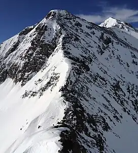 Purple Peak, elevation 12,800-feet (3,901 m), is situated in the Elk Mountains which are a subrange of the Rocky Mountains.[2] The peak is located nine miles (14 km) northwest of the community of Crested Butte in the Raggeds Wilderness on land managed by Gunnison National Forest. It is set on the crest of the Ruby Range between Afley Peak to the north and line parent Mount Owen to the southwest. Precipitation runoff from the mountain's northeast slope drains into Oh-be-joyful Creek which is a tributary of the Slate River, and the west and south slopes drain into Silver Creek and Ruby Anthracite Creek, thence North Fork Gunnison River. Topographic relief is significant as the summit rises 1,760 feet (536 m) above Blue Lake in one-half mile (0.80 km). The landform's toponym was officially adopted in 1965 by the United States Board on Geographic Names.[5] This landform should not be confused with Purple Mountain, five miles to the north.