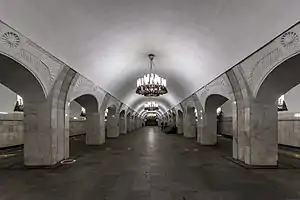 Pushkinskaya (Russian: Пушкинская) is a station on Moscow Metro's Tagansko-Krasnopresnenskaya Line. Opened on 17 December 1975, along with Kuznetsky Most as the segment which linked the Zhdanovskaya and Krasnopresnenskaya Lines into one. Like its neighbour, the station was a column tri-vault type, which had not been seen in Moscow since the 1950s. Arguably the most beautiful station on the Line, the architects Vdovin and Bazhenov took every effort to make it appear to have a 'classical' 19th century setting. The central hall lighting is created with stylised 19th century chandeliers with two rows of plafonds appearing like candles, while the side platforms have candlesticks with similar plafonds. The columns, covered with 'Koelga' white marble are decorated with palm leaf reliefs and the grey marble walls are decorated with brass measured insertions based on the works of the great Russian poet Alexander Pushkin. The grey granite floor completes the appearance of the masterpiece. Architecturally the station put the final stop to the functionality economy design of the 1960s and went against Nikita Khrushchev's policy of struggle to avoid decorative 'extras', which left the stations of 1958–59 greatly altered in their design.