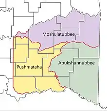 The Pushmataha District was named in honor of Pushmataha, a revered Choctaw warrior and statesman who was chief of Okla Hannali, the Six Towns District, one of the three historic, major clan divisions of the Choctaw in their historic territory of the Southeast. The other two districts were the Apukshunnubbee District and Moshulatubbee District.[1]