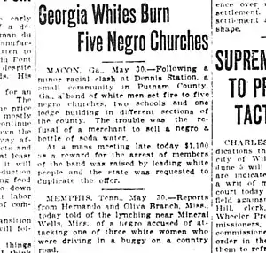• The Wheeling Intelligencer (May 31, 1919). "Georgia White Burn Five Negro Churches". The Wheeling Intelligencer. Wheeling, West Virginia: Intelligencer Pub. Co. pp. 1–24. OCLC 13502337. Retrieved July 19, 2019.