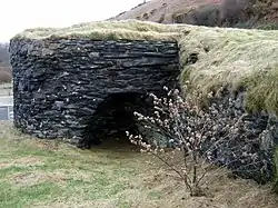 There is a medium-sized "three-quarter" lime kiln by the beach, used for converting the limestone brought in by boat to quicklime. This was used on the land, in this case on Dinas Island.