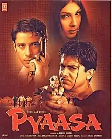 Pyaasa (transl.eternally thirsty) is a 2002 Indian Hindi-language film directed by A. Muthu. The film tells the story of Suraj (Aftab Shivdasani), a young man, full of dreams, aspirations, desire, but no money. He is desperate for money. He meets the anchor of his life, Sheetal Oberoi (Yukta Mookhey in her first major leading role in Hindi cinema), boss of a Mega Corporate company, who has a lot of money with her.[1][2]