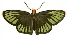 Upper side: Antennae thickest in the middle. Head scarlet. Thorax and abdomen black. All the wings green brassy coloured, the nerves black, those parts that surround the body being of a raven black. The tips of the anterior wings orange coloured.