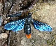 The body and its vestiture are black, apart from the apical segments of the abdomen which are bright reddish in both sexes (3 segments in females, 4 in males). Two species of Scolia are similarly coloured, but have swarthy wings and a red spot in each ocular sinus (or sini oculares, the "bays" bordered by the kidney-shaped eyes). In males, unlike Scolia, the propodeum has two distinct horizontal lobes, which project well behind the insertion of the petiole.[2]