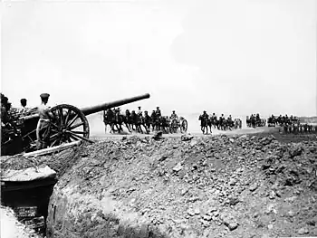In land service, limited numbers were mounted for use as fixed coast artillery. In addition, some Mark IV guns were mounted on converted 40-Pr Rifled Breech Loading Gun carriages for use by batteries of the Royal Garrison Artillery (Volunteers) from the early 1900s. The 1st Ayrshire and Galloway Royal Garrison Artillery (Volunteers) received a number of these guns in 1903 to provide armament for their three heavy batteries.[6] These batteries were semi-mobile and equipped with limbers, which could be drawn by horses or gun tractors. They continued in use with artillery units of the Territorial Force, with some being used into the First World War.