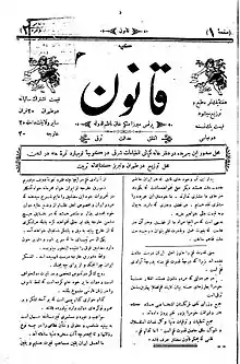 Qanun was established by Mirza Malkam Khan in 1890, and the first issue appeared on 20 February 1890.[1][3][4] Although Mirza Malkam Khan had been the envoy of Qajar Empire to London, at some point he became an ardent critic of Nasreddine Shah and started Qanun to attack him.[1] Before his establishment of the paper Mirza Malkam Khan had been fired by the Shah from the post, but he did not return to Iran and stayed in London.[5][6] The predecessor of Qanun was Mirza Malkam Khan's work entitled Daftar-i Qanun (1860; Persian: Manual of Law).[7] Initial audience of Qanun was the members of a defunct secret society established by Mirza Malkam Khan in Tehran in 1858.[8] The paper was published in a simple format and employed a plain version of Persian language.[9] Between its start in 1890 and 1892 Qanun was published on a monthly basis.[1][10]