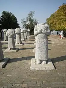 Leading into the mausoleum is a spirit way, which is flanked on both sides with stone statues like the later tombs of the Song dynasty and Ming dynasty tombs. The Qianling statues include horses, winged horses, horses with grooms, lions, ostriches, officials, and foreign envoys.[18] The khan of the Western Turks presented an ostrich to the Tang court in 620 and the Tushara Kingdom sent another in 650; in carved reliefs of Qianling dated c. 683, traditional Chinese phoenixes are modelled on the body of ostriches.[19] Historian Tonia Eckfeld states that the artistic emphasis on the exotic foreign tribute of the ostrich at the mausoleum was "a sign of the greatness of China and the Chinese emperor, not of the foreigners who sent them, or of the places from which they came".[19] Eckfeld also asserts that the 61 statues of foreign diplomats sculpted in the 680s represents the "far-reaching power and international standing" of the Tang dynasty.[20] These statues, now headless, represent the foreign diplomats who were present at Emperor Gaozong's funeral.[1] Historian Angela Howard notes that along the spirit ways of the auxiliary tombs—such as Li Xianhui's—the statues are smaller, of lesser quality, and fewer in number than the main spirit way of Qianling leading to Emperor Gaozong and Wu's burial.[21] Besides the statues, there are also flanking sets of octagonal stone pillars meant to ward off evil spirits.[6] A 6.3 m (20.7 ft) tall tiered stele dedicated to Emperor Gaozong is also located along the path, with a written inscription commemorating his achievements; this is flanked by Wu Zetian's stele which has no written inscriptions.[6] An additional stele by the main tumulus was erected by the Qianlong Emperor (r. 1735–96) during the mid-Qing dynasty.[1]