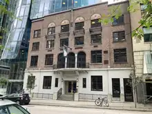 The holding company, the Quadra Holding Company, Limited, received its certificate of incorporation on 28 July 1928.[10] The club received its building permit in May 1929.[11] Architects for the new building were Sharp and Thompson. Their design was for a four story building in the Spanish Colonial Revival style, which reflected the club's Spanish namesake. In the basement was the billiards room and lounge; at the back of the first floor was the reading room; the second floor held the dining rooms and kitchen; and the third and fourth floors held 10 bedrooms each. The new clubhouse opened on Saturday, 11 January 1930. An announcement said, "the reception will be of an informal nature and will take place chiefly in the main dining-room, where tea will be served from large tables, beautifully arranged with the season's flowers."[12] On Valentine's Day 1930, the annual ball took place for the first time in the new clubhouse. The Province wrote, "the Quadra ball is every one of the most important functions of the early New Year, but this season there will be an added lustre to its usual brilliance, for it is taking place in spacious new quarters, and guests will have the added attraction of inspecting the various rooms thrown open for their convenience."[13]