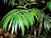 A bush to 2 metres tall, with narrow leaves, 10 cm long, alternate on the stem. Stems are usually not straight, (which indicates spasmodic growth patterns). Leaves are dark glossy green above, and paler below. The leaf veins are at a wide angle in relation to the mid-rib. Small green/red flowers form in clusters of one to four flowers. The fruit is a hairy red drupe, 5 to 10 mm long.[2]