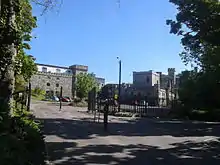 Entrance to Queen's Tower. The main house is to the right, the former stable block to the left.