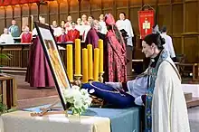 In the bidding, Canon Katie Lawrence, Acting Dean of Wellington Cathedral of St Paul, and Justin Duckworth, Bishop of Wellington, paid tribute "to a greatly loved Queen" for her "steadfast pilgrimage of faith", her "example of service", and for "the duty which she rendered unflinchingly to her country and the Commonwealth".[17]