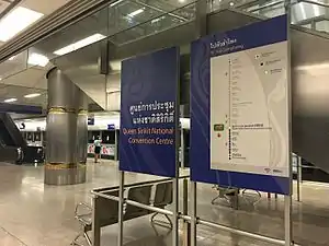 Queen Sirikit National Convention Centre MRT station (Thai: สถานีศูนย์การประชุมแห่งชาติสิริกิติ์, RTGS: Sathani Sun Kanprachum Haeng Chat Sirikit, code BL23) or QSNCC station is a Bangkok MRT station on the Blue Line. Located under Ratchadaphisek Road, near Queen Sirikit National Convention Centre, Benjakitti Park, PAT Stadium and Khlong Toei Market.