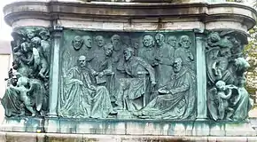 The pedestal sits on a tall square plinth with rounded corners accompanied by four bronze lions at the ordinal points. Around the plinth is an unbroken bas relief frieze of bronze. At the corners, facing ordinal points, are four figurative sculptures, each depicting an allegory of Freedom (northeast), Truth (southeast), Wisdom (southwest) and Justice (northwest).[2] On the four cardinal faces are near life size likenesses of fifty three prominent British figures from the Victorian era. Of the fifty three persons depicted upon the plinth of the Queen Victoria Monument only two are women: George Eliot and Florence Nightingale. Five of those depicted were born in Lancaster or the surrounding area: William Turner, Edward Frankland, Richard Owen, William Whewell, James Williamson, 1st Baron Ashton.