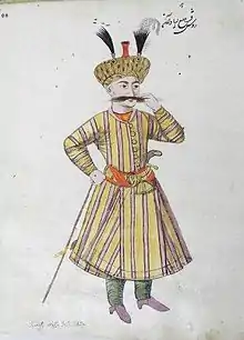 Local rulers also had qurchis at their disposal, though they were limited in number.[9] The vali (governor, viceroy) of Georgia had a qurchi corps to serve him, including a qurchi-bashi, and a legion of specialized qurchis for his "accoutrements" (i.e. qurchi-e zereh, qurchi-e kafsh, qurchi-e tarkesh, etc.).[9]