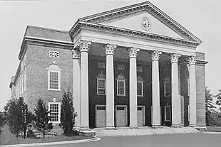 The title of the school hymn, originally written as the school song in 1949 by Olive Thomasina ("Tommye") Ring, "Her Portals Tall and Wide," refers to the large columns of the Auditorium. The Auditorium's portico and columns stand at three stories tall and face downtown Winston-Salem.