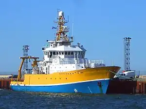 The ship took 33 days to travel to her new homeport of Rimouski, passing through the Panama Canal. After arrival, the ship went into drydock for conversion to a research vessel, which included the installation of more powerful generators. Renamed Coriolis II, the ship's main scientific focus is to study the sediment in the Saint Lawrence River.[4] The vessel's research efforts currently lies between Île d'Orléans and the Cabot Strait.[5] In February-March 2014, Coriolis II sailed to San Jorge Gulf in Argentina to study the gulf's ecosystem and geology as part of Argentina's efforts to understand its maritime resources and environment.[6][7] In June 2014, the ship was hired by a subcontractor of Shell Canada to perform geological surveys for oil exploration off the Nova Scotia coast.[8]