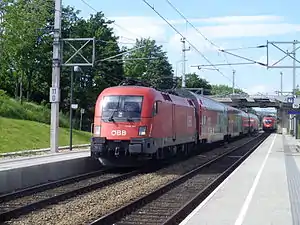 R 500 operates trains further southwest to Payerbach-Reichenau using the same route. The combined R500 and R 510 service operates half-hourly (quarter-hourly during rush hours) service between Vienna and Wiener Neustadt.[2] R 510 trains operate as expresses, between the two cities, making limited stops whereas local service is offered by the S1 and S2 of the Vienna S-Bahn. R 510 route ends at Wien Floridsdorf in Northern Vienna and R 900 route begins. Some R 510 trains end at Floridsdorf and head back to Wiener Neustadt while others continue to Bernhardsthal and some continue to Retz (R 510/903 service). There are two daily R 510/900 trains operating directly between Wiener Neustadt and Breclav, however all other service between the two cities is offered by R 500/900 service.[1]