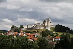 The first mention of Rabí Castle dates from 1380,[2] although it is not known exactly when it was founded. It is likely that the Lords of Velhartice established it after 1300 to protect trade routes along the Otava and also to inspect gold-bearing deposits in it.[lower-alpha 2] They built a strong palace, ramparts and a keep. Subsequent owners, the Švihovský of Rýzmburk family, continued building work and built the outer ward and two square towers.