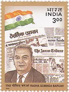 Radha Govinda Baruah (Assamese: ৰাধাগোবিন্দ বৰুৱা) (17 October 1900[1] – 15 July[2] 1977[1][2]) was the founder of The Assam Tribune, a group of news papers. Radha Govinda Baruah, an enterprising person in Dibrugarh, first conceived the idea of launching an English daily. With some help from his friends and well wishers, he brought out an English weekly newspaper instead of a daily on 4 August 1939 under the editorship of Lakshminath Phookan, former editorial staff of Hindustan Standard, a leading daily of Anand Bazar Group, Kolkata.[3] He founded the Assam Tribune in 1939.[4] He was a sports enthusiast,[1] who was president of the Assam Cricket Association for over a decade.[2] The iconic Nehru Stadium in Guwahati was built under his leadership in 1962. He is also noted for his contributions to the society and culture of Assam.[1][2][4] He is called "the architect of modern Assam"[1][5] for his being "instrumental in realising the educational needs" of the Assamese people.[5] Radha Govinda Baruah College (or R G Baruah College) in Guwahati is named after him. He is also called the Sinhapurush ("Lion Man") for his immense bravery and enthusiasm.[5]