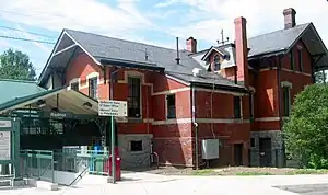 The Radnor station was originally built in 1872.[4] It was a replacement for the former Morgan's Corner Station built by the Philadelphia and Columbia Railroad.[5] The station was designed by Joseph M. Wilson and Frederick G. Thorn, both later of Wilson Brothers & Company, architects. Radnor's design was a brick variant of Wynnewood station, with a two-story agent's residence addition. A nearly identical version of Radnor Station was built by the Pennsylvania Railroad at Hawkins, just east of Pittsburgh.[6]