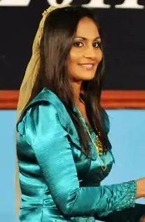 2010 witnessed a "new rise" in Rameeza where she recorded for several films including Veeraana and Niuma while remaking some old classical songs like "Ey Zamaana" and "Saahibaa" for Dhin Veynuge Hithaamaigaa and "Hiyy Adhu Ronee Ey" for Heyonuvaane.[5] The song "Aadhey Aadhey" from Zalzalaa En'buri Aun released during the same year fetched her a Gaumee Film Award nomination for Best Female Playback Singer.[6] A sequel to her song of the same name from the film Zalzalaa (2000), "Aadhey Aadhey" was praised by the music critics for her "haunting" vocals.[5] In 2011, the Government of Maldives honoured her with the National Award of Recognition, which Rameeza attributed as her biggest achievement.[2] She is celebrated as one of the few singers who remains in the top of the industry since the 1990s.[5]