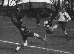 Gunnarsson (right) scoring for Hammarby IF in a game against Johanneshofs IF on 6 May 1917.