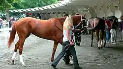 ![]() Rags to Riches in the paddock area at Belmont Park during the day of the Belmont Stakes (June 9, 2007) | |